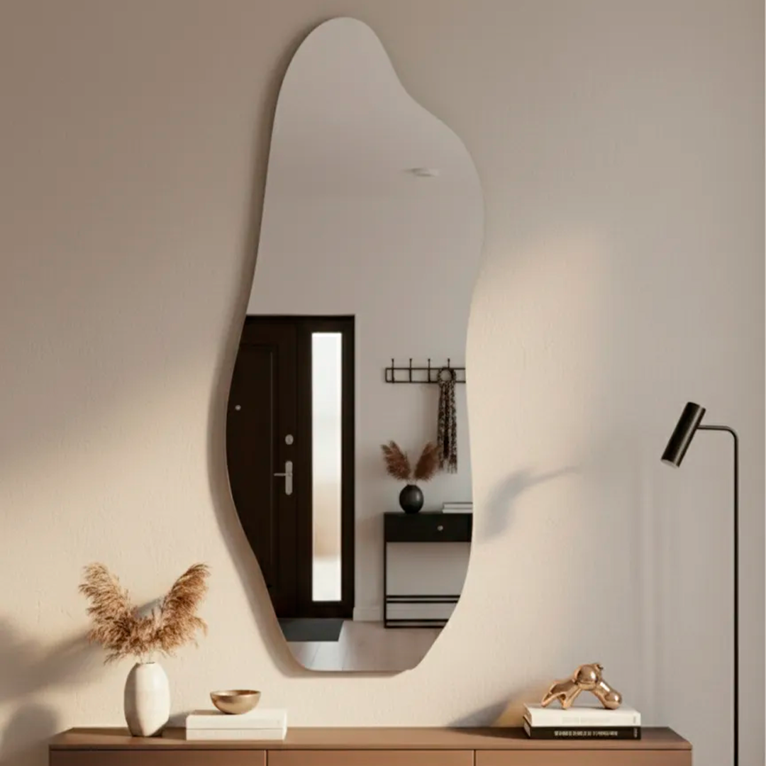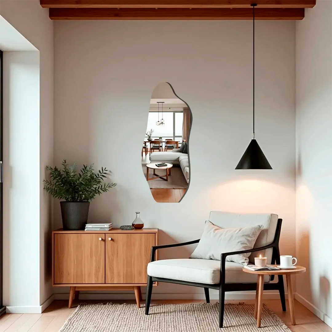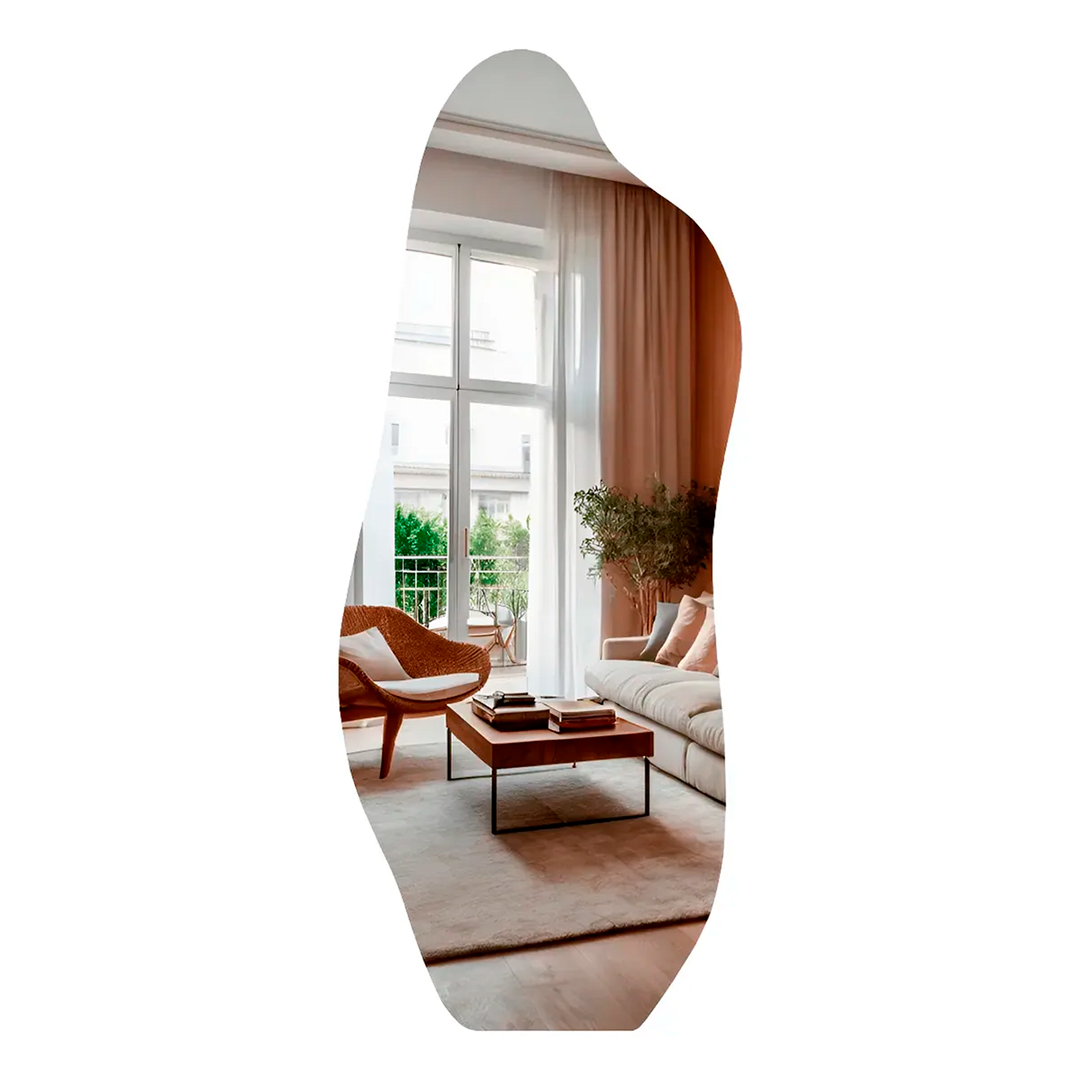 Com medidas compactas de 90x40cm, ele se ajusta perfeitamente a diferentes espaços, criando a ilusão de amplitude e iluminando o cômodo. O Espelho Orgânico Parede é mais do que um simples objeto funcional; é uma peça de design que agrega beleza e valor ao seu ambiente.